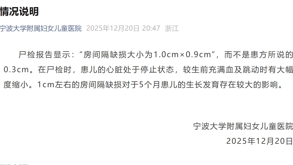 宁波大学附属妇女儿童医院12月20日发布情况声明。【详细】