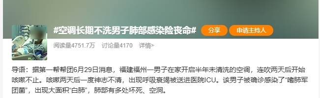 炎炎夏日,空调可谓是“续命神器”。但是在享受清凉的同时,你是否注意到空调也需要定期清洗?近日,话题“空调长期不洗男子肺部感染险丧命”登上微博热搜,引发关注。