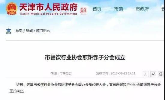据2018年天津政务网消息,天津市餐饮行业协会煎饼馃子分会举办会员代表大会,宣布天津市餐饮行业协会煎饼馃子分会正式成立。同时协同天津市质量管理研究所,尽快制定天津煎饼馃子相关标准,让天津的煎饼馃子发扬光大。