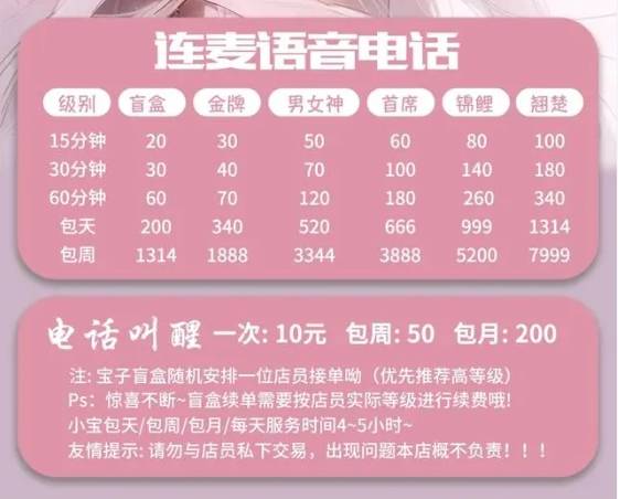 此类服务消费价格差异很大,比如有店铺的陪聊人员分为“盲盒、金牌、男女神、首席、锦鲤和翘楚”不同级别,级别越高价格越贵,此外还分不同服务时长,从消费15分钟到包周都有,有的店铺包月的费用最高达3万元。