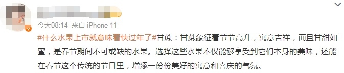 还有网友赋予了这些水果美好的寓意:砂糖橘是大吉大利、草莓是没有烦恼、车厘子是红红火火、甘蔗是节节高升……