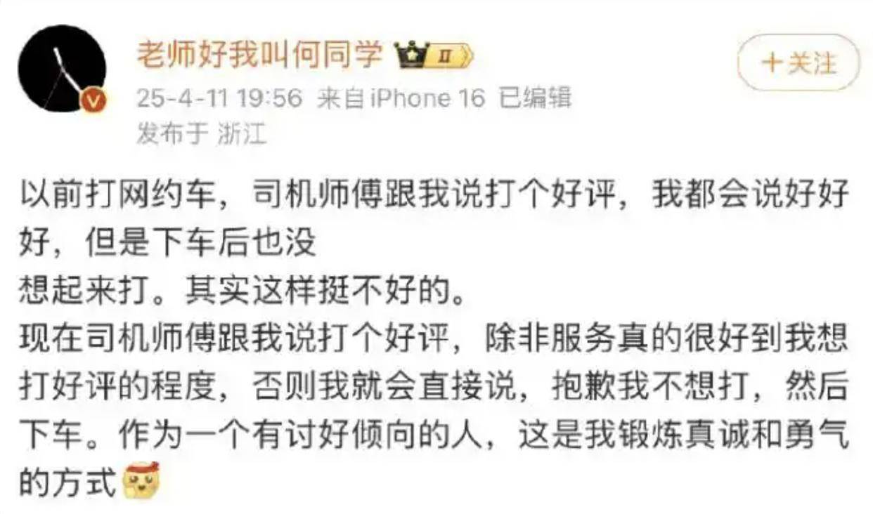 近日,B站千万级粉丝博主何同学因关于网约车司机求好评的言论,被推上微博热搜。事情源于何同学在社交平台分享的一次打车经历:过去他总会口头答应司机的好评请求,但事后忘到脑后;如今他选择直接拒绝,并称这是“克服讨好型人格的锻炼”。