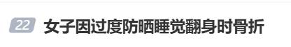 今日(5月15日),#女子因过度防晒睡觉翻身时骨折#冲上微博热搜榜单。据报道,成都一女子怕晒黑从没穿过短袖,结果因为过度防晒在睡觉翻身时竟直接导致骨折。入院检查后发现其体内只有7.8的VD含量,加速了溶骨、破骨的过程。医生提醒:缺乏维生素D或导致骨质疏松!