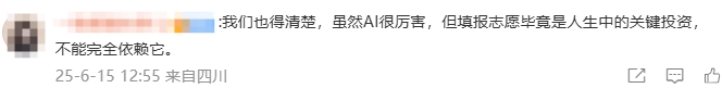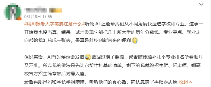 AI填志愿,是“神助攻”还是“大忽悠”,网友们也看法不一。有人认为,有AI辅助,确实轻松好多↓↓↓