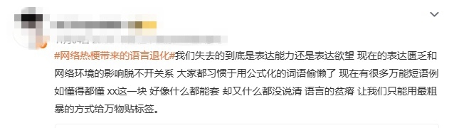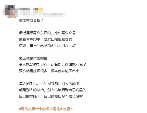 其实,不只孩子们爱用网络热梗,成年人也热衷使用各种梗和表情包, “张口忘词”的现象并不少见。比如这位网友说,她发现自己有很多感悟,但表达不出来,自己的观点和输出都没有了: