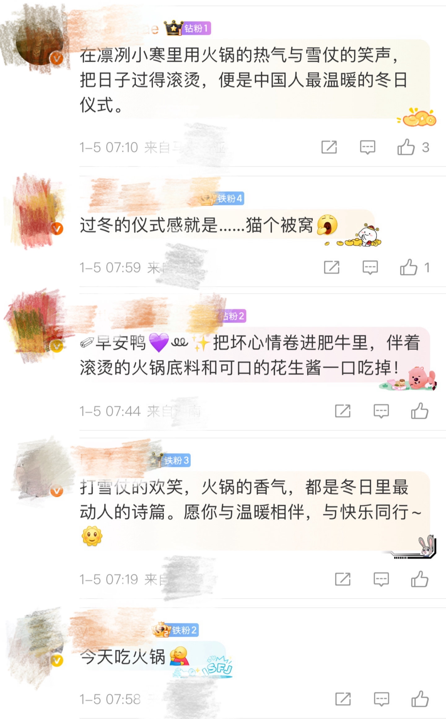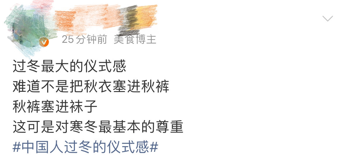 寒意愈浓,人间的暖意与仪式感也愈发鲜明,不少网友发帖留言,分享自己的过冬仪式感,比如穿上秋裤、吃顿火锅、打个雪仗……这些小事,让寒冬变得热气腾腾,充满暖意。