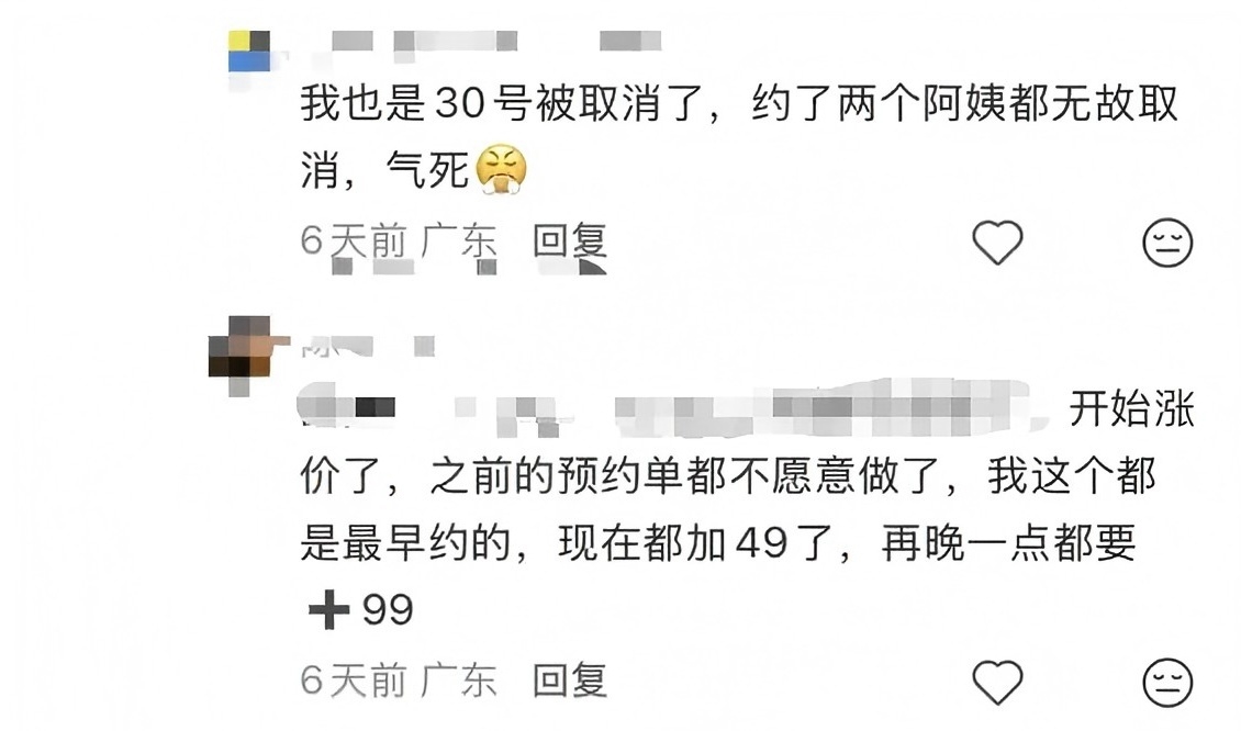 还有网友表示:自己预约的年前家政保洁订单被无故取消。