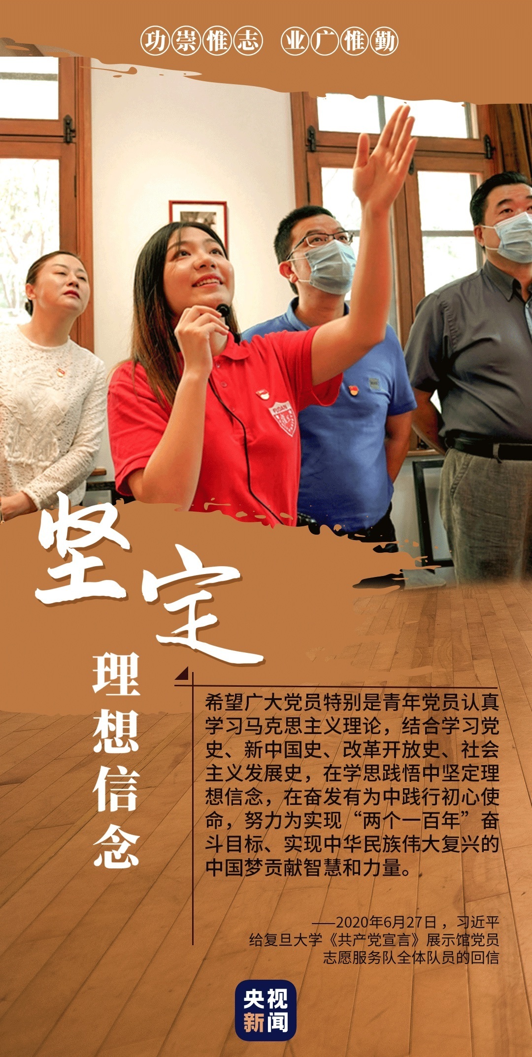 心有所信,方能行远。2020年6月底,习近平在给复旦大学《共产党宣言》展示馆党员志愿服务队全体队员回信时说,面向未来,走好新时代的长征路,我们更需要坚定理想信念、矢志拼搏奋斗。