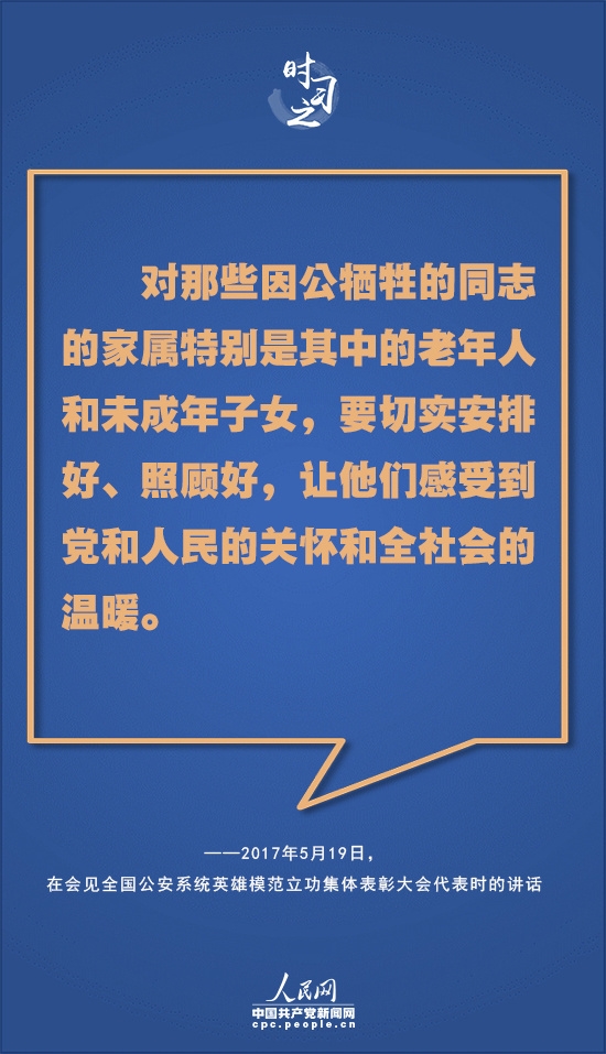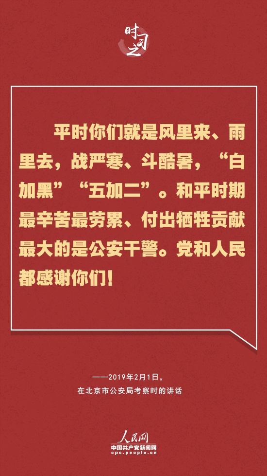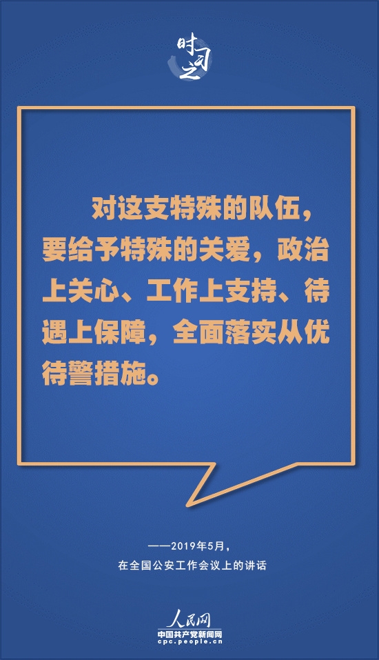 对人民警察这支和平时期“牺牲最多、奉献最大”的特殊队伍,习近平多次表达感谢——“你们用实际行动兑现了‘人民公安为人民’的庄严承诺,弘扬了正气,发挥了榜样作用,不愧为党的群众路线的忠实践行者,不愧为人民群众的贴心人,党和人民感谢你们。”“正是有了你们的辛勤付出和流血牺牲,才换来了广大人民群众的安宁和幸福。你们不愧为党和人民的忠诚卫士,党和人民感谢你们。”“平时你们就是风里来、雨里去,战严寒、斗酷暑,‘白加黑’‘五加二’。和平时期最辛苦最劳累、付出牺牲贡献最大的是公安干警。党和人民都感谢你们!”