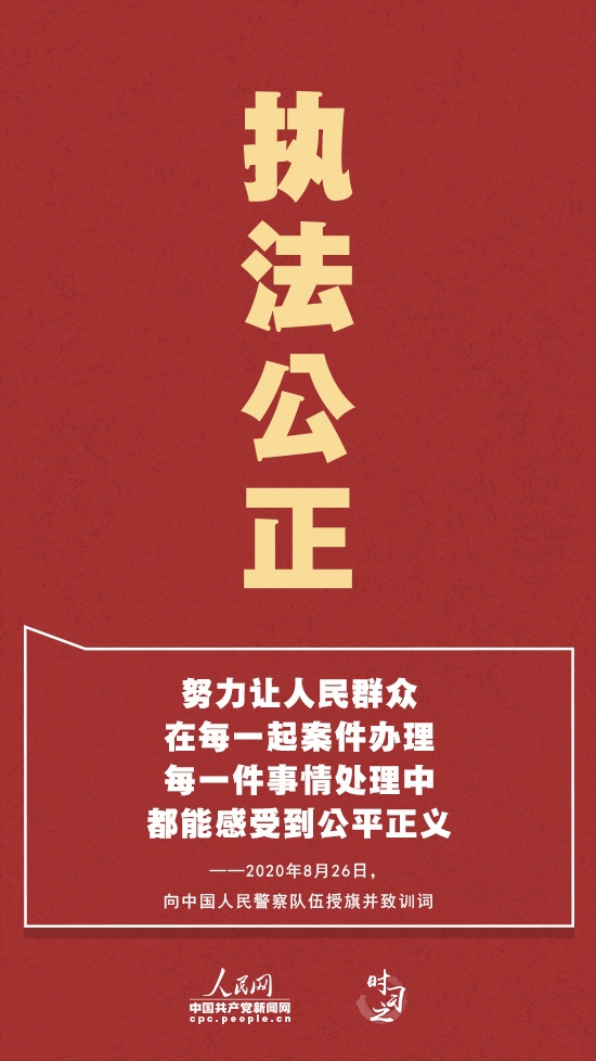 执法公正——“公平正义是政法工作的生命线。”公安执法工作量大面广,与老百姓生活密切相关。新时代,执法公正上升到新的高度,凝聚着习近平总书记对广大公安民警的殷切期望。习近平强调,要抓住关键环节,完善执法权力运行机制和管理监督制约体系,努力让人民群众在每一起案件办理、每一件事情处理中都能感受到公平正义。