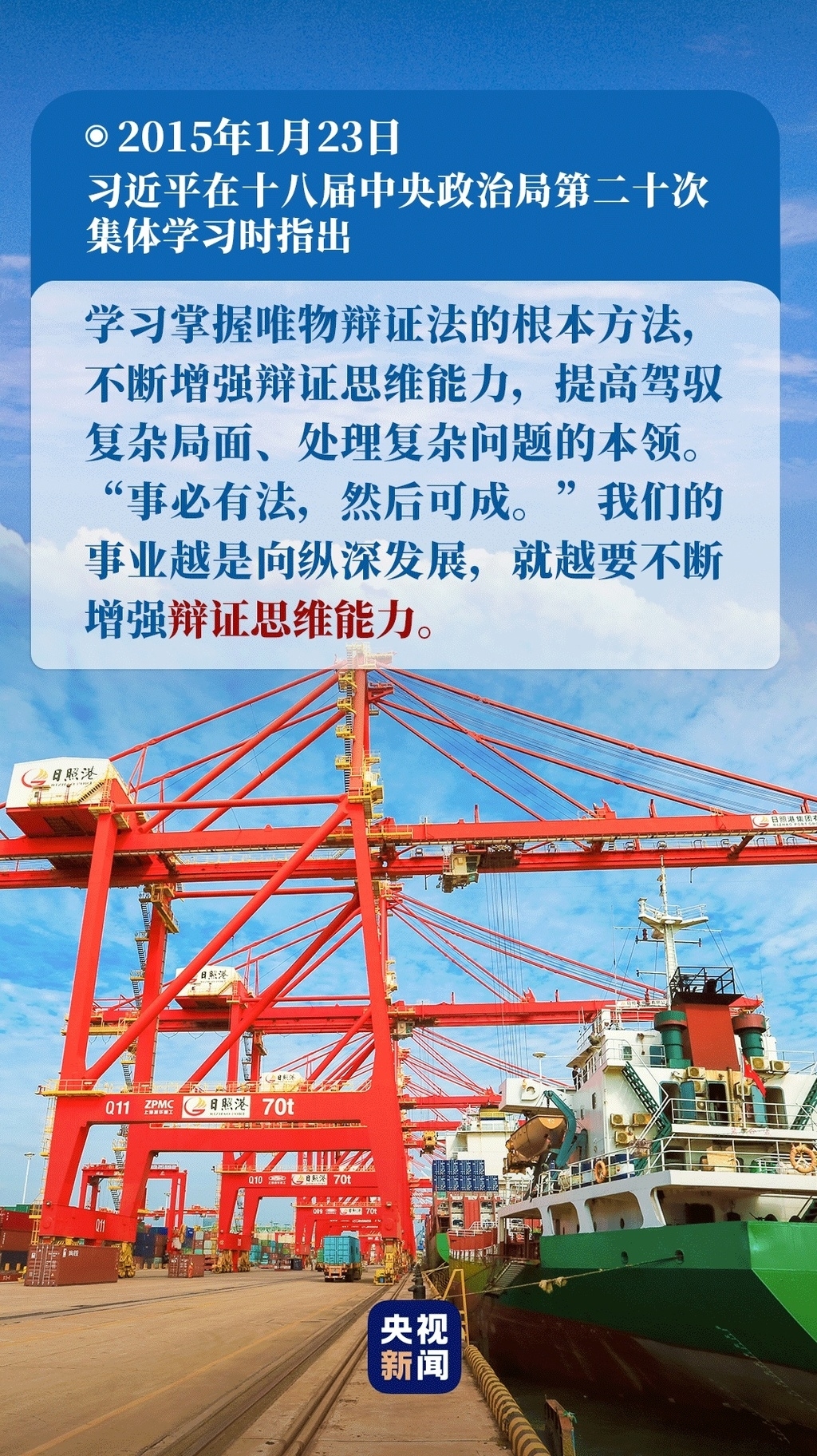 “要坚持发展地而不是静止地、全面地而不是片面地、系统地而不是零散地、普遍联系地而不是单一孤立地观察事物,妥善处理各种重大关系。”2015年1月23日,习近平在十八届中央政治局第二十次集体学习时的讲话中,对如何在实际工作中运用唯物辩证法,作出了深刻阐述。