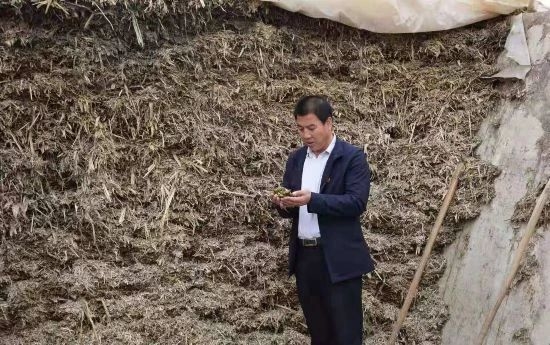 ▲宁夏固原市西吉县庞湾村第一书记高士平查看青贮池腌草情况。