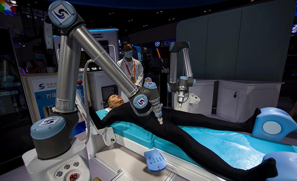 △2020年服贸会综合展区,参观者正在体验中医智能经络导引机器人。