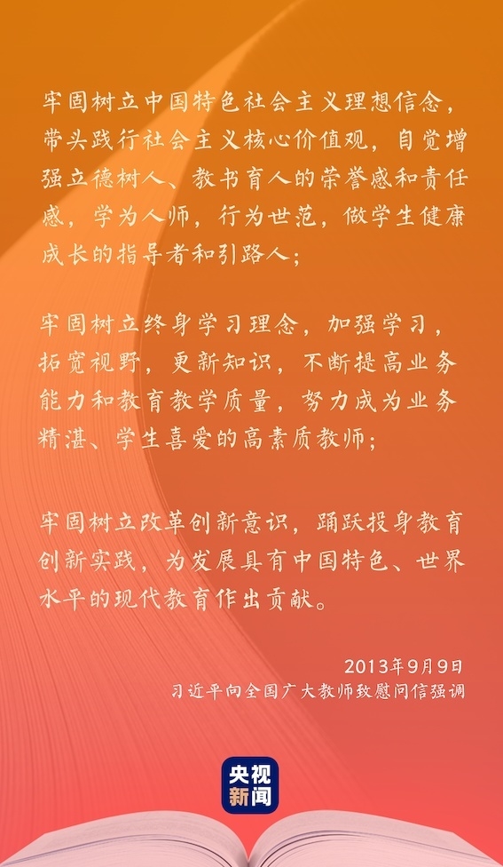 2015年9月9日,习近平给“国培计划(2014)”北京师范大学贵州研修班全体参训教师回信,指出“ 发展教育事业,广大教师责任重大、使命光荣”。