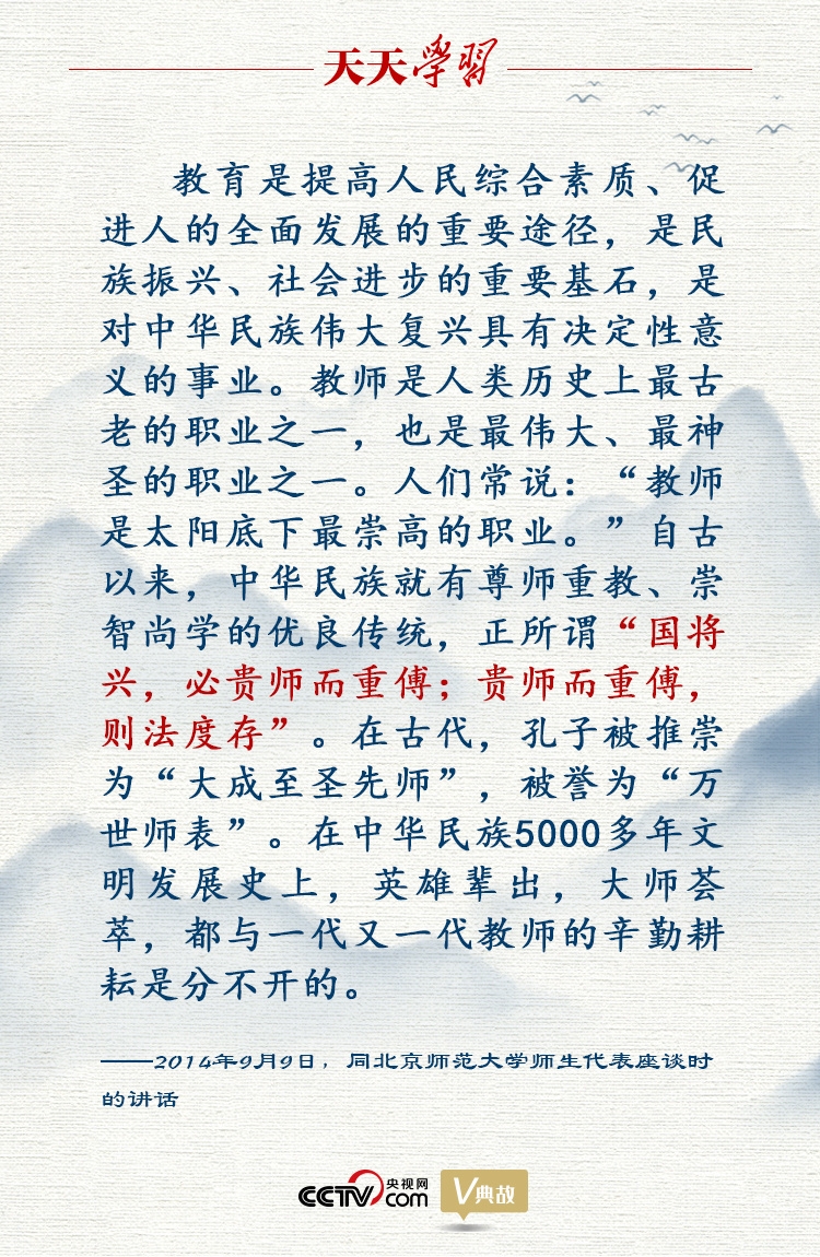 2014年9月9日,习近平总书记到北京师范大学考察,与学校师生代表亲切座谈时指出,教师重要,就在于教师的工作是塑造灵魂、塑造生命、塑造人的工作。一个人遇到好老师是人生的幸运,一个学校拥有好老师是学校的光荣,一个民族源源不断涌现出一批又一批好老师则是民族的希望。