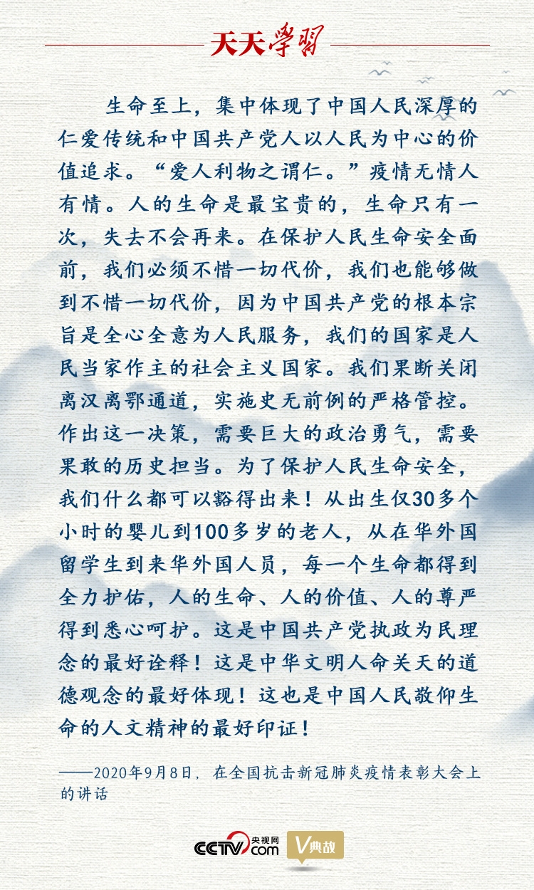 在近万字的讲话中, 习近平总书记多次提到“人民”和“生命”。他还借 “爱人利物之谓仁”这句古语阐明生命至上的历史文化根源,充分展现了中华文明的深厚底蕴。