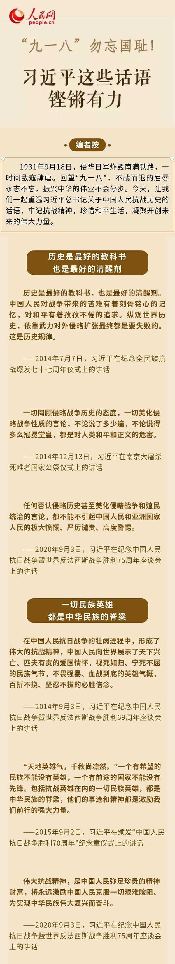 原标题:“九一八”勿忘国耻!习近平这些话语铿锵有力
