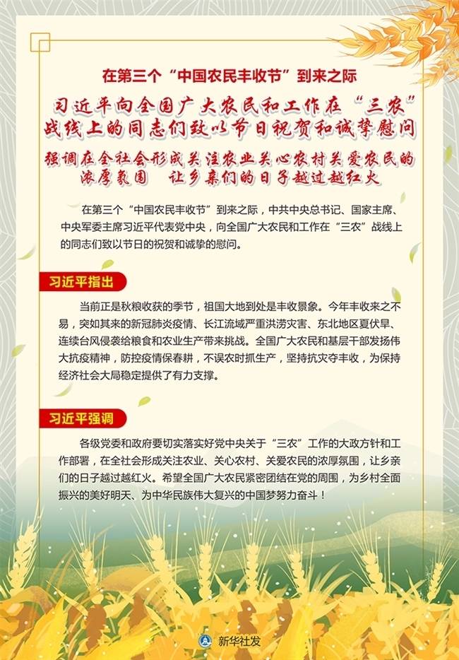 新华社北京9月21日电 在第三个“中国农民丰收节”到来之际,中共中央总书记、国家主席、中央军委主席习近平代表党中央,向全国广大农民和工作在“三农”战线上的同志们致以节日的祝贺和诚挚的慰问。
