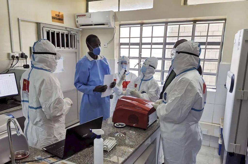 在南苏丹首都朱巴的一处新冠病毒检测机构,中国抗疫医疗专家组成员与南一线医护人员交流(8月21日摄)。新华社发(中国驻南苏丹大使馆供图)