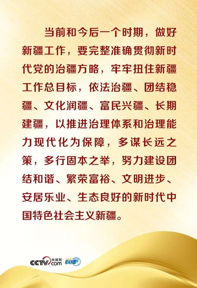 联播+9月25日至26日,第三次中央新疆工作座谈会在北京召开,习近平总书记出席会议并发表重要讲话。在讲话中,习近平总书记全面总结了第二次中央新疆工作座谈会以来新疆工作取得的重大成效,深入分析了当前新疆工作面临的形势,阐释了新时代党的治疆方略,明确了当前和今后一个时期新疆工作的指导思想、目标任务、方针政策、战略举措,全面部署了推动新疆社会稳定和长治久安的重点工作。央视网《联播+》特梳理总书记对当前和今后一个时期新疆工作的部署要点,以飨读者。