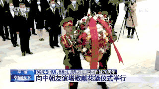 国歌毕,礼兵将花篮安放至塔基平台处。红色缎带上题写着“中国人民志愿军烈士永垂不朽”。全体人员默哀,向志愿军先烈们致以崇高的敬意。