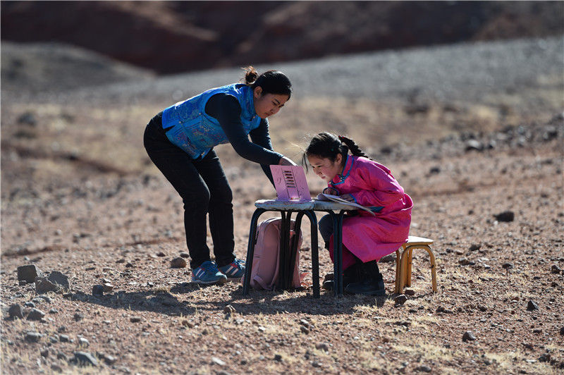 9岁的策耿(右)在家附近的戈壁上网课(4月1日摄)。策耿是内蒙古自治区阿拉善左旗蒙古族学校四年级学生。由于疫情防控,策耿父母长期雇佣的一名外省羊倌没能回到当地,一家人只好回到阿拉善左旗乌力吉苏木温都尔毛道嘎查的牧区家中照看羊群。期间,策耿一边协助父母,一边上网课。新华社记者 刘磊 摄