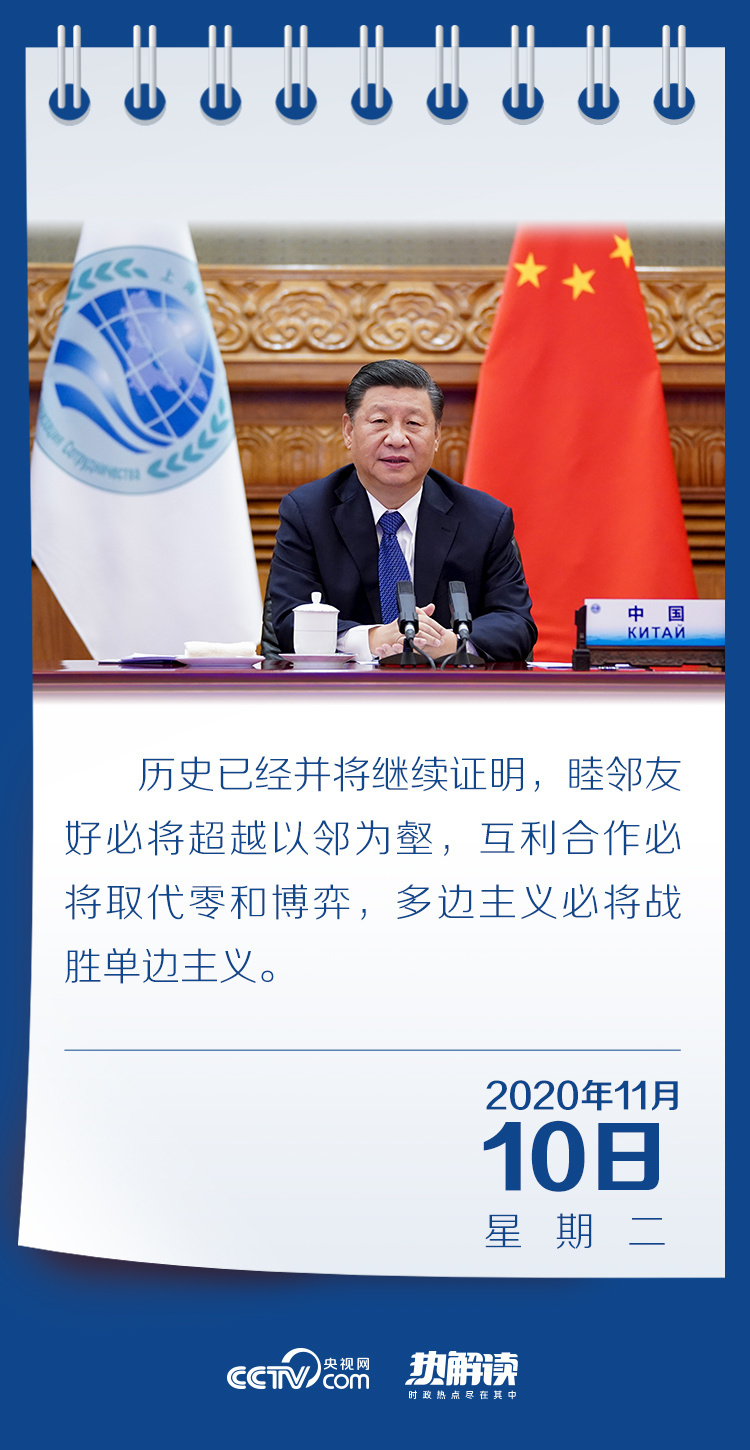 11月10日晚,习近平主席以视频方式出席上海合作组织成员国元首理事会第二十次会议,并发表题为《弘扬“上海精神” 深化团结协作构建更加紧密的命运共同体》的重要讲话。