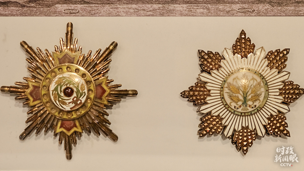 △这是民国政府颁授给张謇的宝光嘉禾勋章(左)和嘉禾勋章(右),以表彰他在实业、教育等方面的救国主张和实践。(总台央视记者彭汉明拍摄)