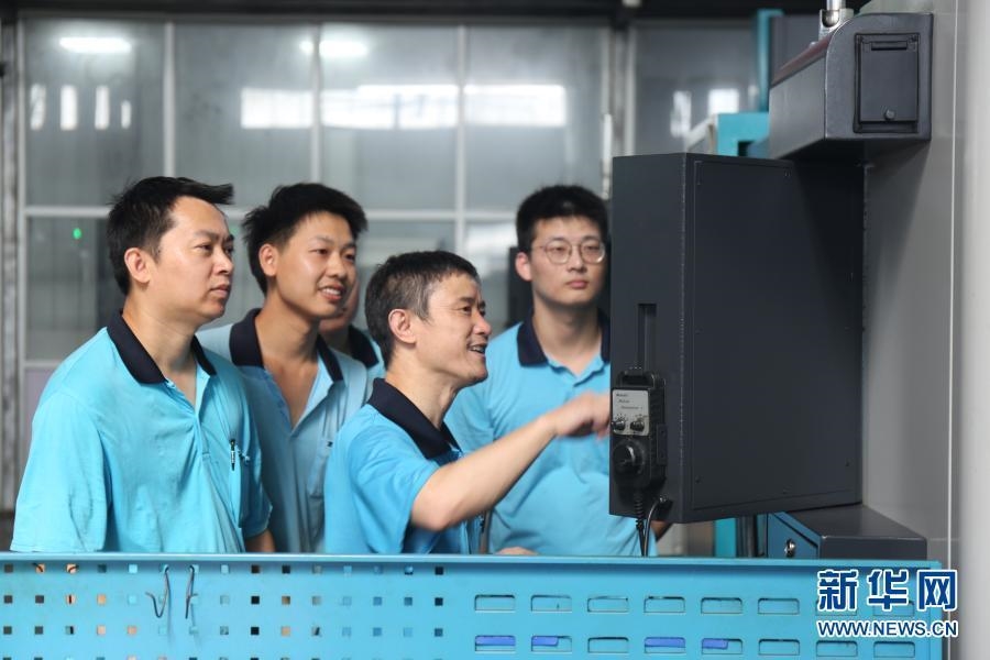 全国劳动模范、宁波中大力德智能传动股份有限公司设备科科长万亚勇(右二)在车间指导员工进行数控机床故障诊断(8月17日摄)。新华社发