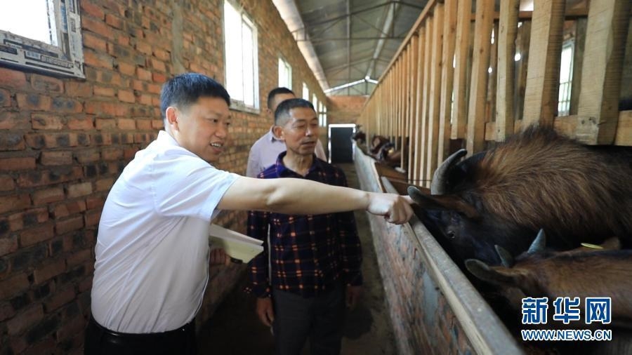 全国劳动模范、四川省南江五郎黄羊养殖专业合作社理事长汪其德(左一)在巴中市南江县红旗村村民家中指导养羊技术(资料照片)。新华社发