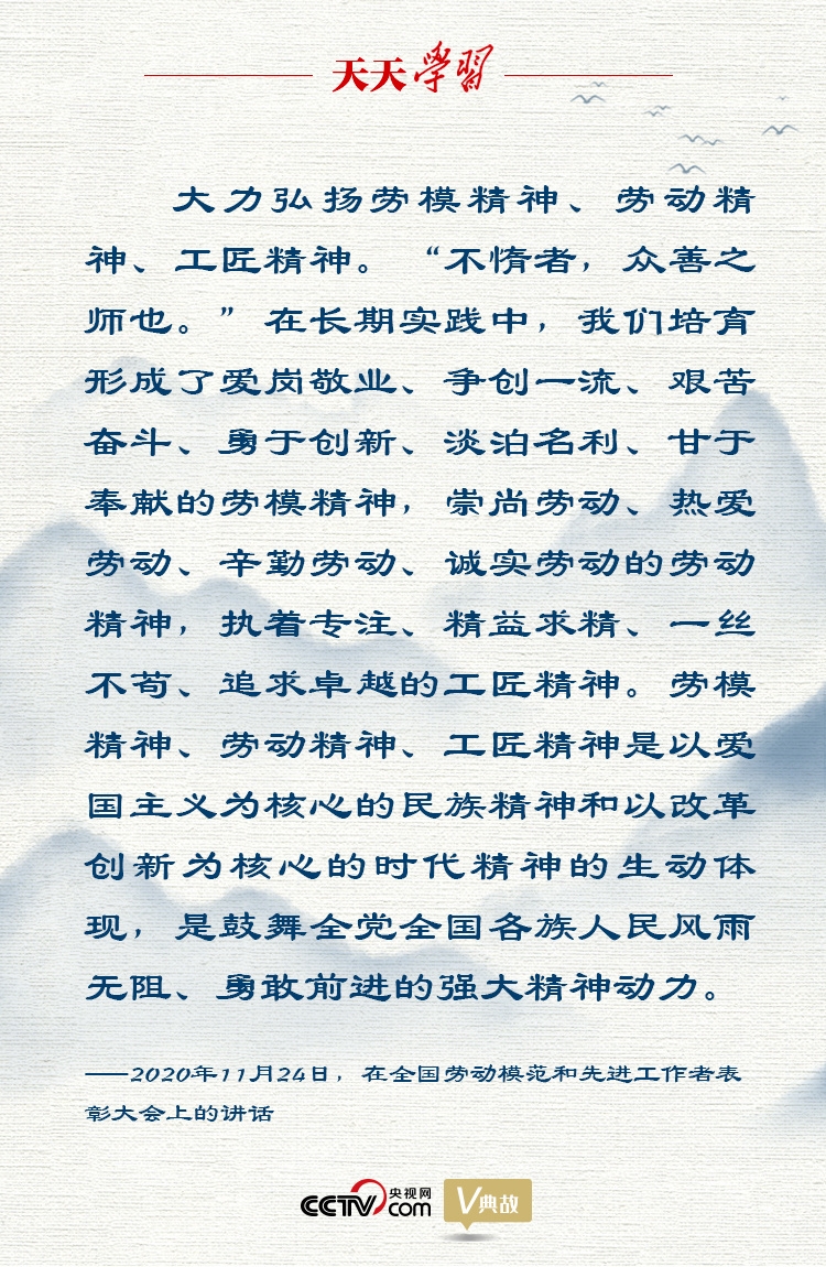 在讲话中,习近平总书记还用“不惰者,众善之师也”这句古语,深刻诠释劳模精神、劳动精神、工匠精神的实质,指出劳模精神、劳动精神、工匠精神是以爱国主义为核心的民族精神和以改革创新为核心的时代精神的生动体现,是鼓舞全党全国各族人民风雨无阻、勇敢前进的强大精神动力。