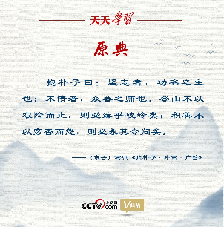在《外篇·广譬》中,葛洪提出:“坚志者,功名之主也;不惰者,众善之师也。登山不以艰险而止,则必臻乎峻岭矣;积善不以穷否而怨,则必永其令问矣。”意思是意志坚定,是建功立业的主导;勤奋不怠,是一切善行的老师。登山不因为艰难险阻而停止,就一定会到达顶峰;行善不因为自身穷困与否而埋怨,就一定会使自己的美誉长久。用登山作譬,指出意志坚定和勤奋不怠是事业成功的重要保证。