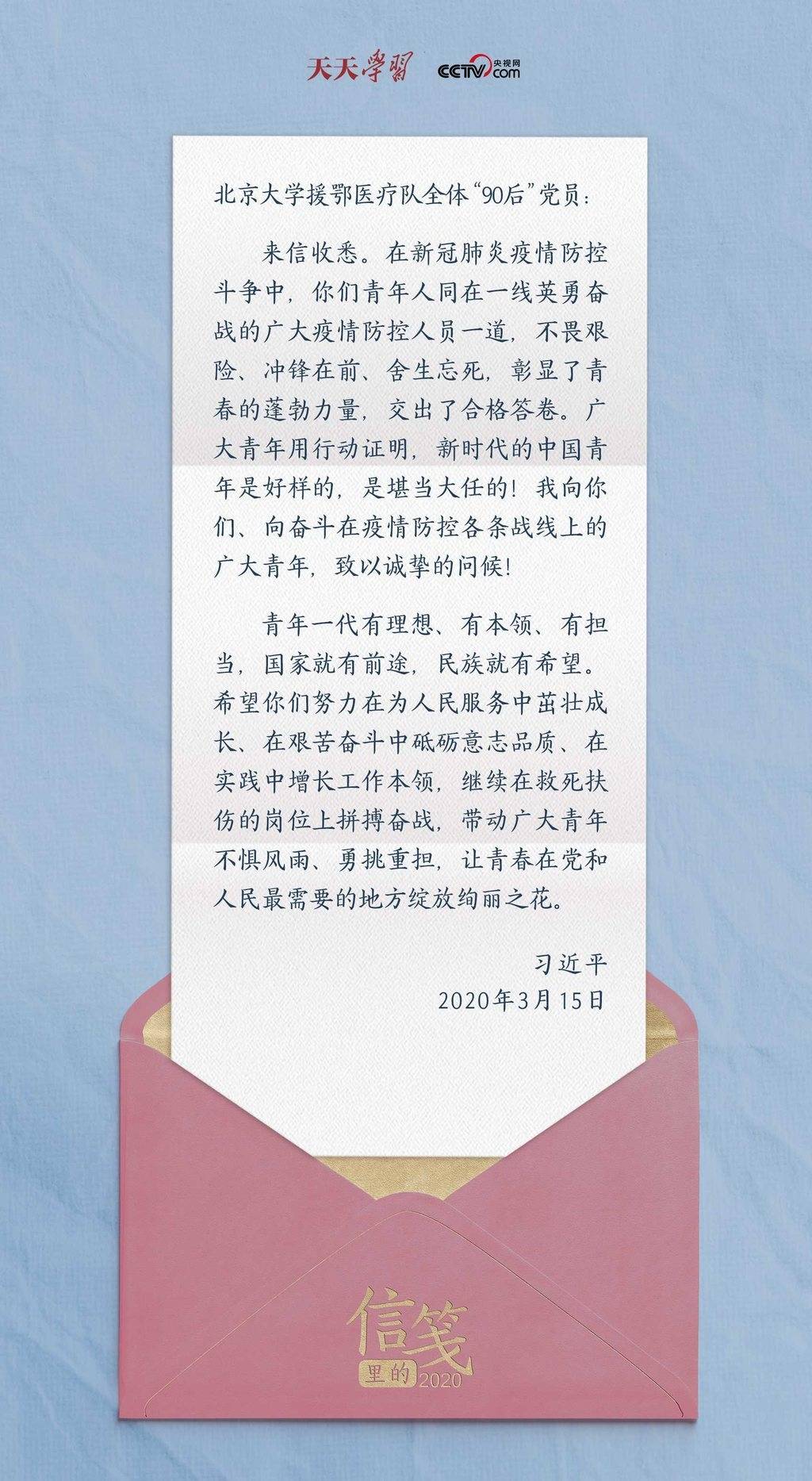 2020年3月15日,北京大学援鄂医疗队全体“90后”党员收到了总书记的回信。回信中,总书记勉励他们让青春在党和人民最需要的地方绽放绚丽之花。