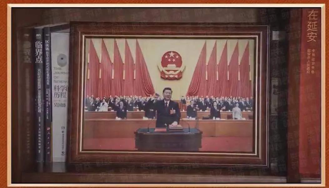 场景:这张照片从2019年新年贺词开始,一直出现在习近平的书架上。在十三届全国人大一次会议上,习近平主席面对近3000名全国人大代表,面对十三亿多人民,庄严进行宪法宣誓。这是新中国成立以来,我国最高领导人首次进行宪法宣誓。