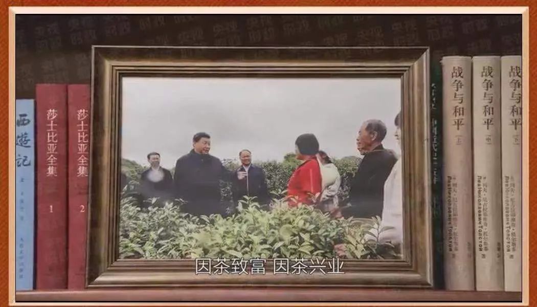 场景:习近平来到的茶园,属于苏陕扶贫协作项目。云雾缭绕中,习近平拾级而上,步入茶园,同现场的茶农亲切交谈。