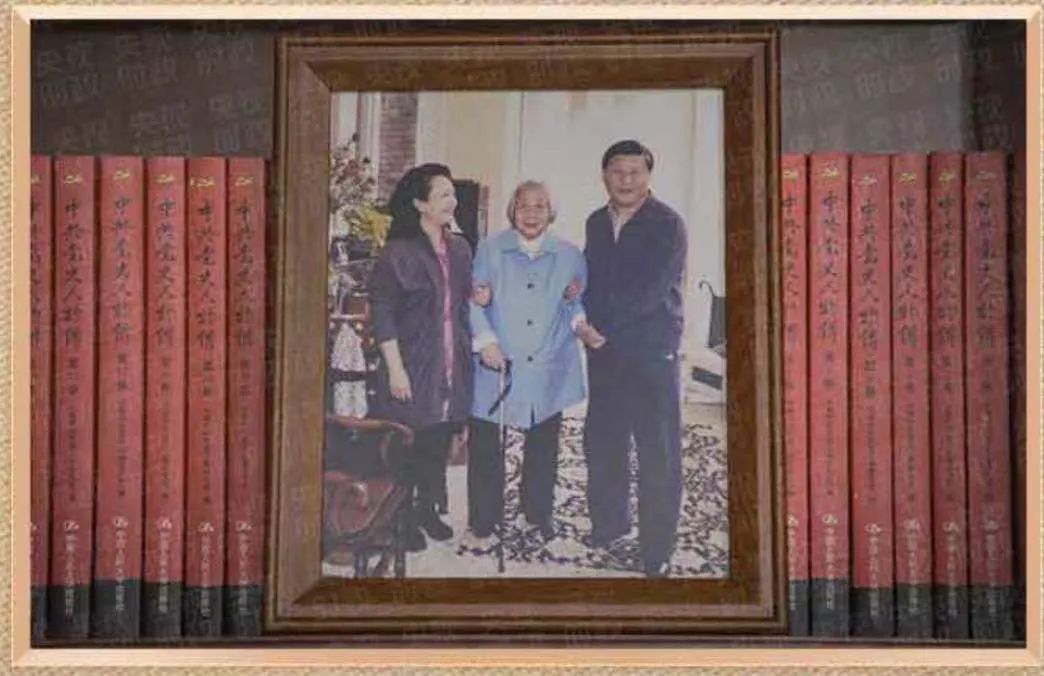 这张照片今年第一次出现在习近平的书架上。照片中,习近平和夫人彭丽媛搀扶着母亲齐心 。