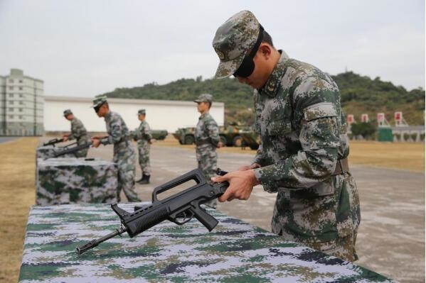 1月4日,驻澳门部队珠海基地组织官兵校场比武。这是战士们蒙眼进行轻武器分解结合。新华社发(叶华敏 摄)