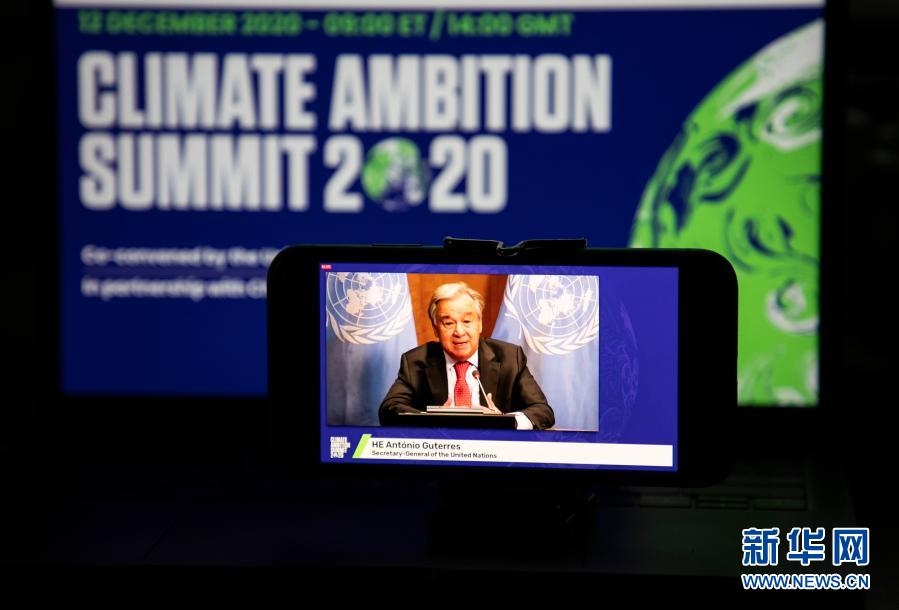 这是2020年12月12日在美国纽约拍摄的联合国秘书长古特雷斯在气候雄心峰会上通过视频发表讲话的屏幕画面。气候雄心峰会由联合国及有关国家倡议举办,旨在纪念《巴黎协定》达成五周年,进一步动员国际社会强化气候行动,推进多边进程。新华社记者 王迎 摄