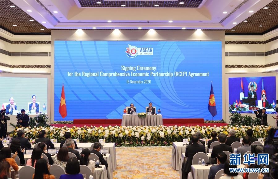 这是2020年11月15日在越南首都河内拍摄的区域全面经济伙伴关系协定(RCEP)签署仪式现场。新华社/越通社