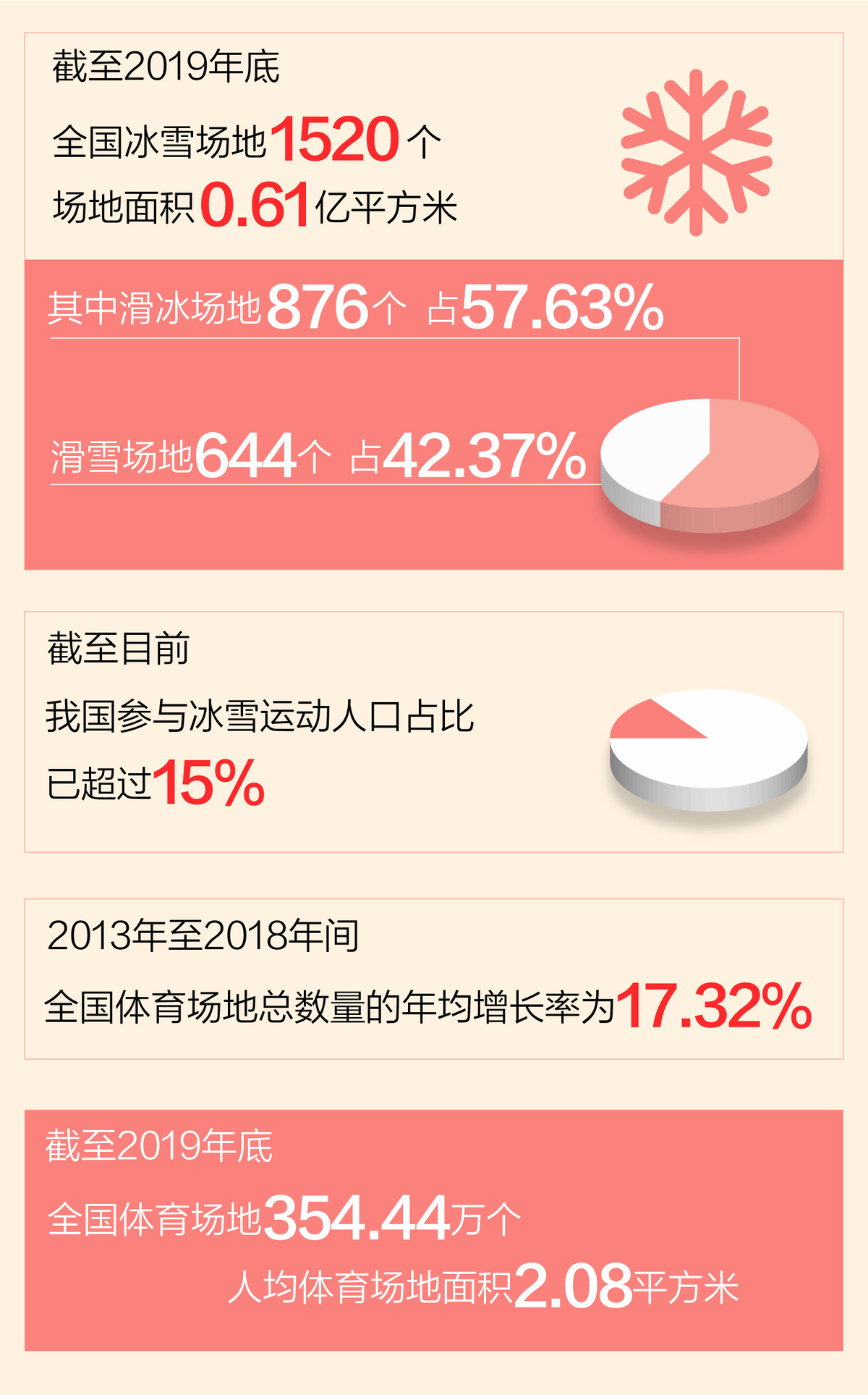 “全国大众冰雪季”“中国冰雪大会”……从北方到各地,从冬季到四季,群众性冰雪活动正开展得如火如荼,为全民健身增添了更加多元多彩的内容。2013年至2018年间,包括冰雪运动在内的全国体育场地总数量年均增长率为17.32%,努力满足着人民群众不断增长的运动健身需要;各级各类群众性体育赛事活动不断丰富,每年参与总人数超过1亿人次,城乡居民参加过群众性体育赛事或展示活动的比例分别达到56.18%和59.36%。神州大地生机勃勃,全民健身蔚为风尚,成为全体人民增强体魄、健康生活的基础和保障。