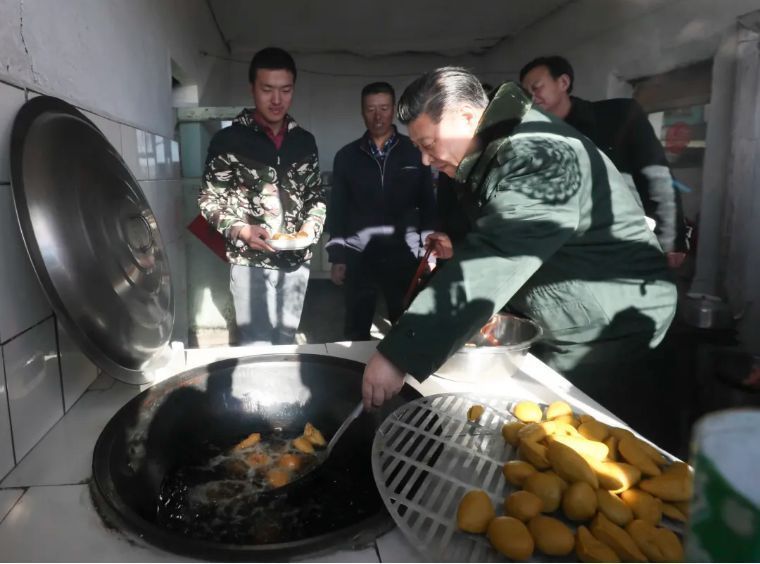 ↑2017年1月24日,习近平在河北张家口市张北县小二台镇德胜村村民徐学海家炸年糕。