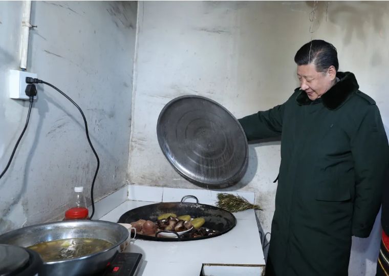 ↑2018年2月12日,习近平在四川阿坝藏族羌族自治州汶川县映秀镇考察时同居民群众一起磨豆花。