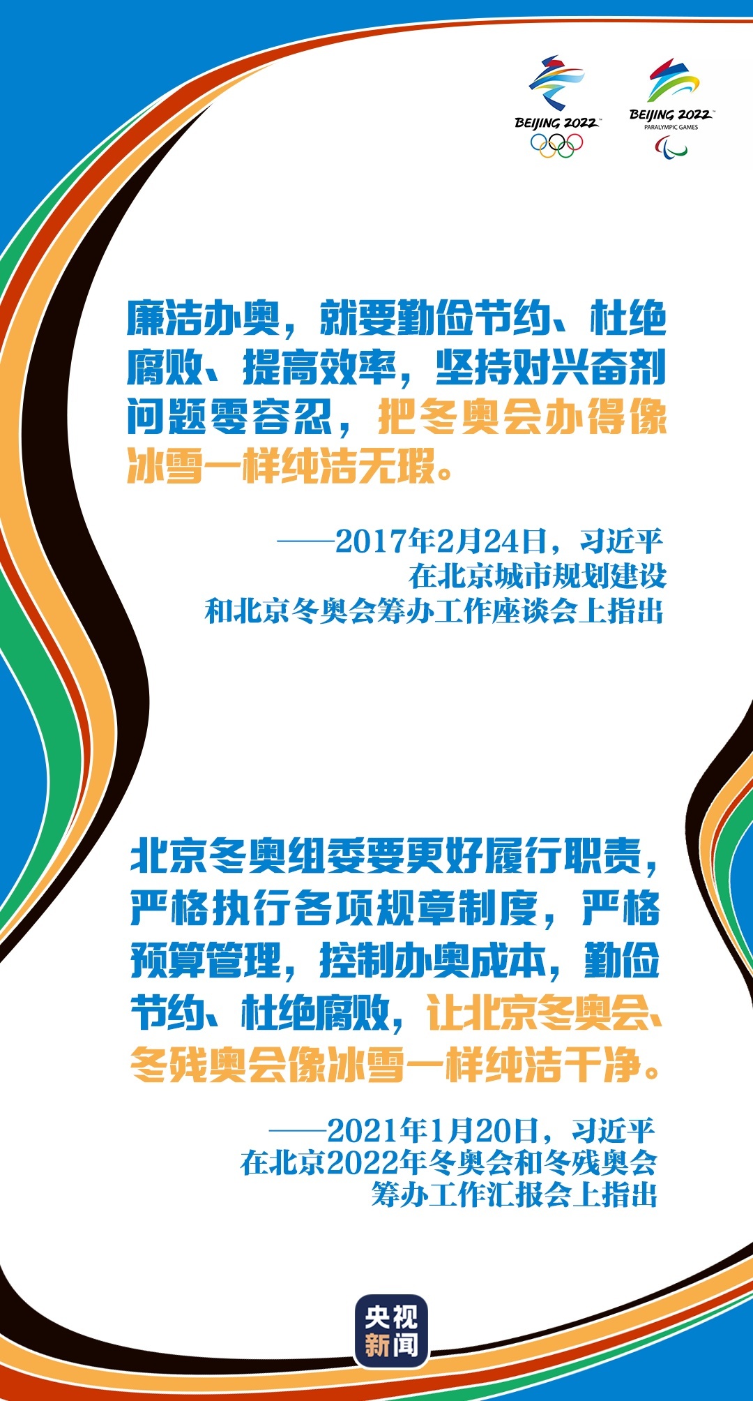 “坚持廉洁办奥,严格预算管理,控制办奥成本,强化过程监督,让冬奥会像冰雪一样纯洁干净。”
