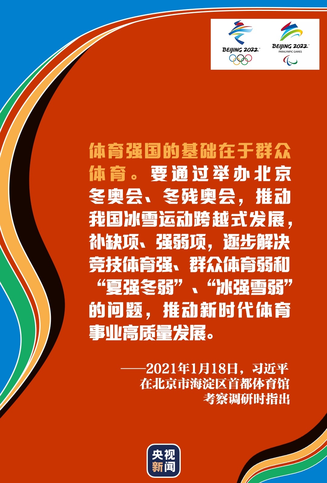 2017年初,习近平主席在会见巴赫时表示,将以北京冬季奥运会为契机,把竞技体育搞得更好、更快、更高、更强,同时大力发展群众体育,通过全民健身实现全民健康,进而实现全面小康目标。