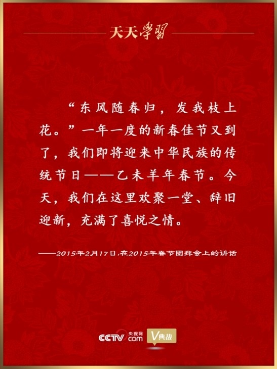 党的十八大以来,习近平总书记多次在腊月二十九举行的春节团拜会上发表重要讲话,盘点旧岁、谋划新年,向全国各族人民、港澳台同胞和海外侨胞拜年,并致以美好的新春祝福。在讲话中,习近平总书记频频引用具有新春节令特点的古代经典诗文名句抒发情怀、畅想未来。这些诗文名句如春风化雨润人心田、暖人心扉,激励着亿万人民在新的一年里追梦前行。