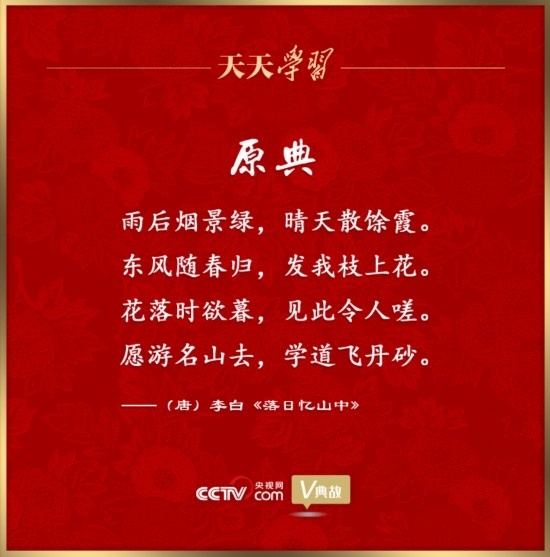 在2015年春节团拜会上的讲话中,习近平总书记开场便引用了李白的“东风随春归,发我枝上花”,为我们展现了一幅亮丽动人的春景图,一股意气风发的豪迈之气油然而生。春华今正浓,秋实自可期。“春天播种,秋天收获。让我们踏着春天的脚步,把人民对美好生活的向往作为奋斗目标,扎扎实实干好各项工作,共同创造祖国的美好未来。”在讲话结尾,习近平总书记发出了动员令,宣示了党中央团结带领人民创造新辉煌的坚定信心,也表达了全体中华儿女奔向伟大梦想的共同期盼!