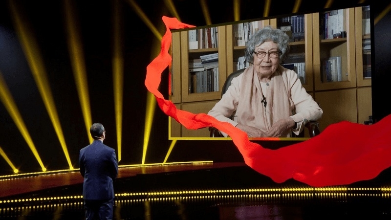 四海弘文,一灯传道,叶嘉莹是“诗词的女儿”、“风雅的先生”。在为叶先生颁奖时,以虚拟技术呈现的诗词研究手稿飘满舞台、汇成长河,凸显了叶先生作为中国传统文化摆渡人的概念。