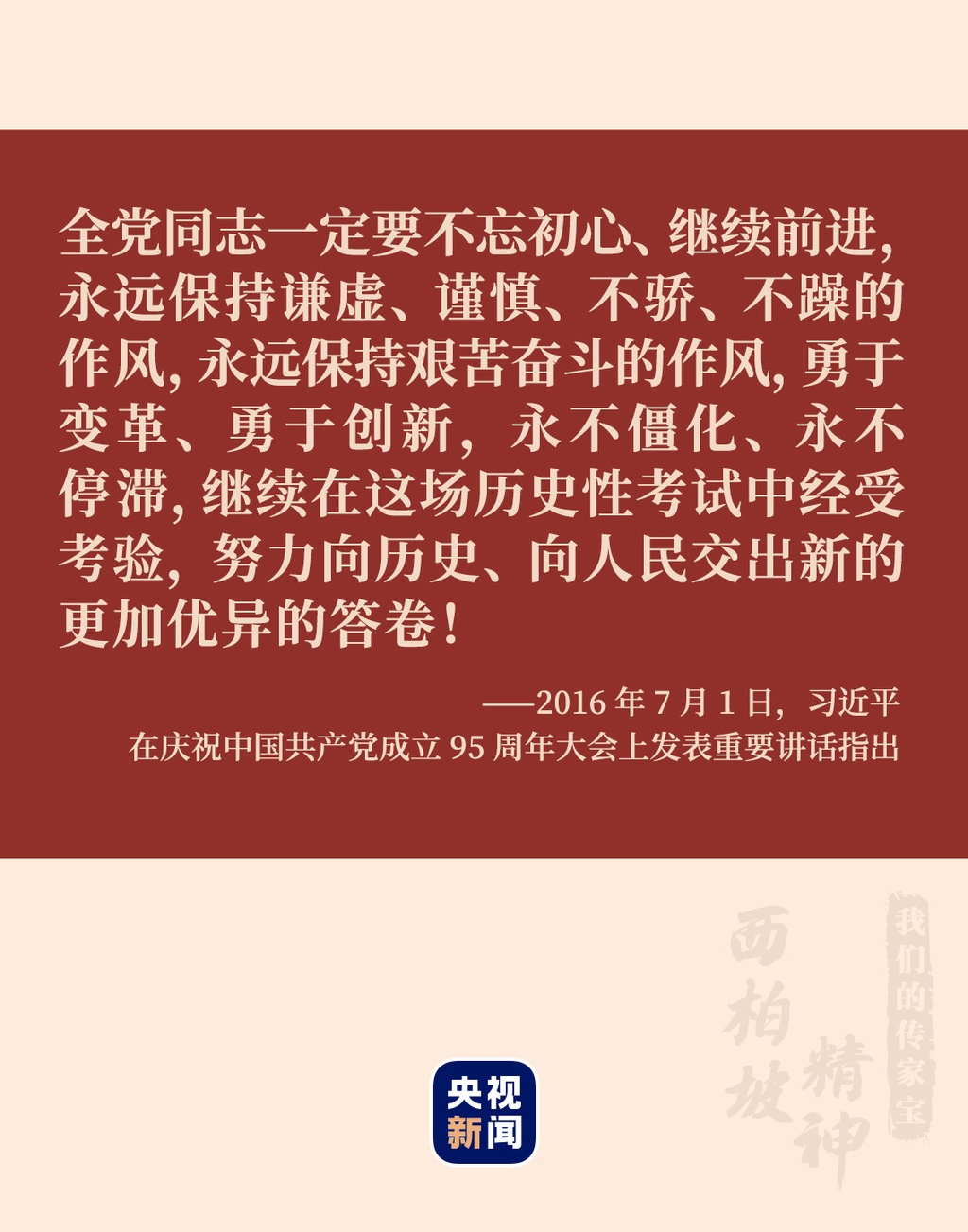 “这场考试还没有结束,还在继续。今天,我们党团结带领人民所做的一切工作,就是这场考试的继续。”2016年7月,习近平总书记在庆祝中国共产党成立95周年大会上继续警醒大家。