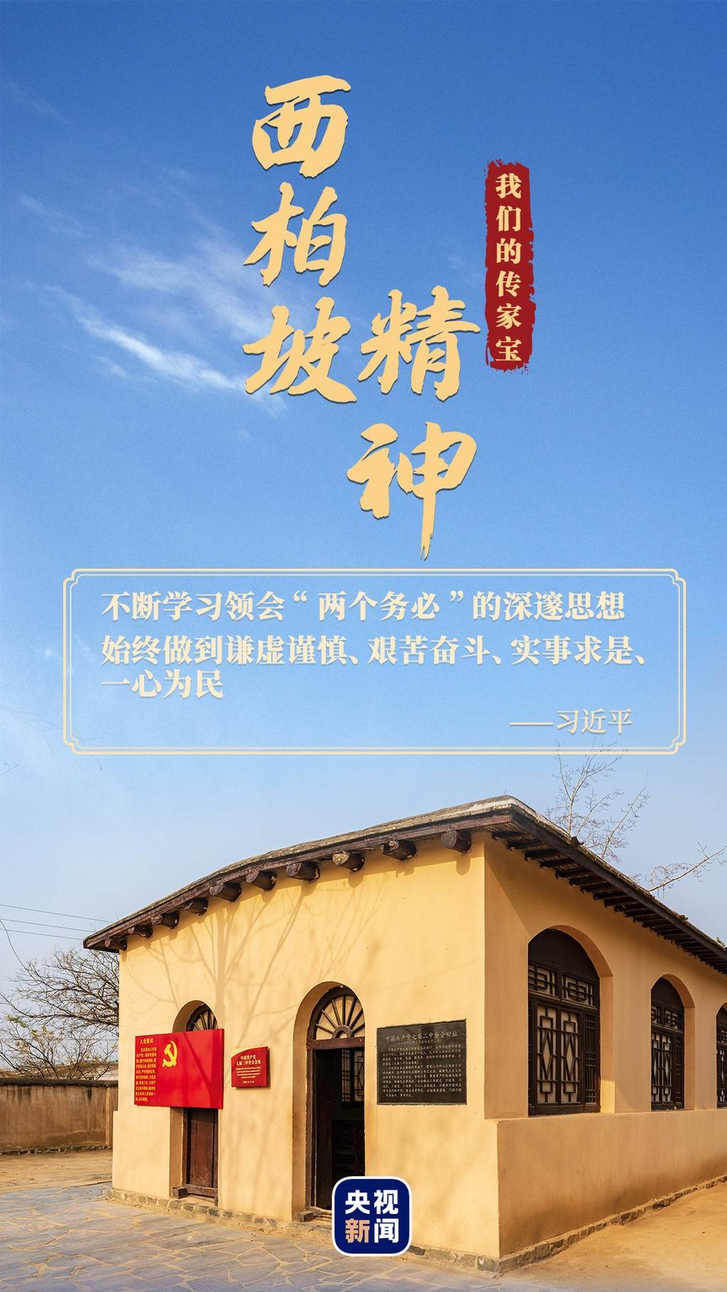 西柏坡中共中央旧址西北角,一间简陋的长条形土坯房成了会场。毛泽东在会上向全党发出“两个务必”的号召:“务必使同志们继续地保持谦虚、谨慎、不骄、不躁的作风,务必使同志们继续地保持艰苦奋斗的作风。”