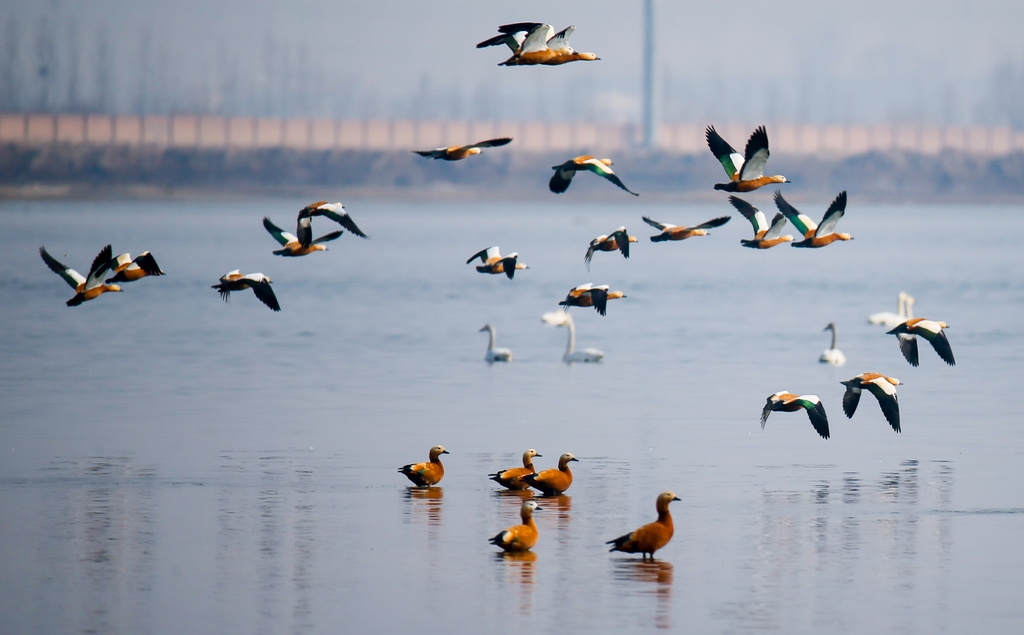 △2021年3月9日,内蒙古呼和浩特市土默特左旗的海流水库,成群的候鸟在水面上嬉戏。